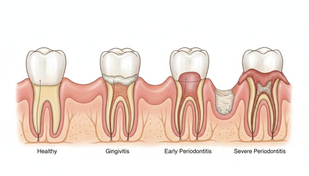 歯周病の進行度は大きく4つのステージに分類され、それぞれ症状や治療法が異なります。早期発見・早期治療が何より重要で、軽度のうちに適切なケアを行えば、健康な状態に戻すことも可能です。