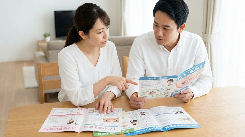 また、治療費の料金体系の確認も事前に済ませておくと安心でしょう。小児矯正の費用は1期治療で20~50万円程度、2期治療で25万〜65万円程度が一般的な目安とされています。ただし、料金体系は医院ごとに異なる点に注意が必要です。トータルフィー制(総額制)では調整料や保定装置代が含まれるケースが多い一方、処置別支払い制だと通院のたびに費用が別途加算される仕組みとなっています。治療期間が想定より長引いた場合にどちらが有利かは症例によって変わるため、見積もりの段階で両方のシミュレーションを出してもらえると判断しやすくなるでしょう。